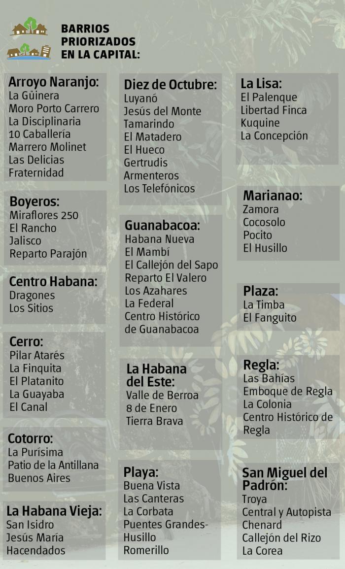 Con la indicación del Jefe de Estado de tratar de llegar a todos los municipios de la capital, y con el protagonismo de las asambleas municipales, los comités municipales del Partido, los intendentes y presidentes de consejos populares, se hicieron las propuestas, quedando inicialmente una lista de 60 barrios donde trabajar de manera priorizada, a la que luego se incorporaron otros cinco, más la Unidad Vecinal número 1 del reparto Camilo Cienfuegos, en La Habana del Este, que este año cumple su aniversario 60 de creado por Fidel, y el cual, debido a su deterioro, se decidió agregarlo en el plan.